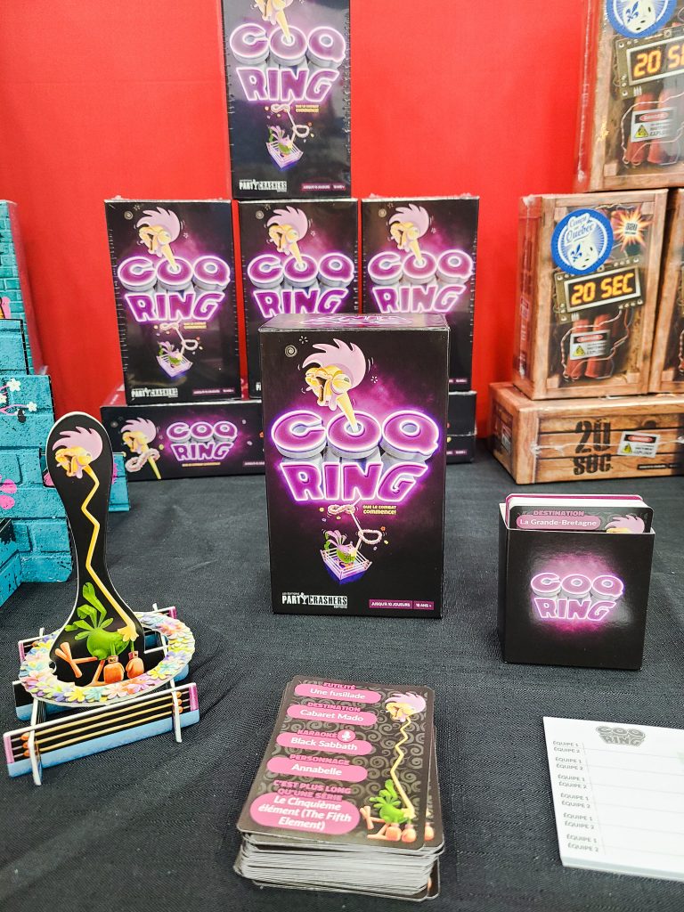 Déjà… juste pour le jeu de mots… 😉 Il faut deviner le contenu au complet d’une carte (environ 5 devinettes par carte) tout en lançant un anneau dans le cou d’un Coq! Ce n’est pas si difficile à deviner, mais en se concentrant sur nos lancées, ça devient très rigolo! C’est le genre de jeu qui peut bien déraper lors d’une fin de soirée un peu arrosée! 😀