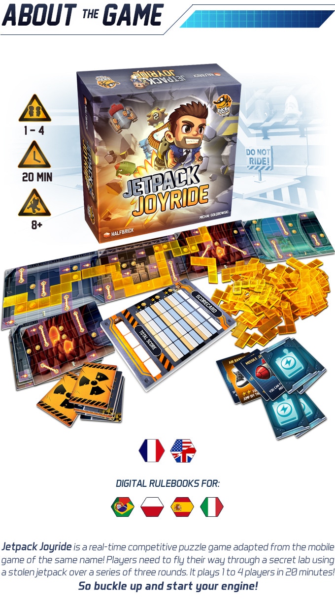 JetPack Joyride est un jeu compétitif en temps réel inspiré du jeu mobile du même nom. Les joueurs doivent naviguer au travers d’un laboratoire secret à l’aide d’un jetpack volé pendant 3 manches.