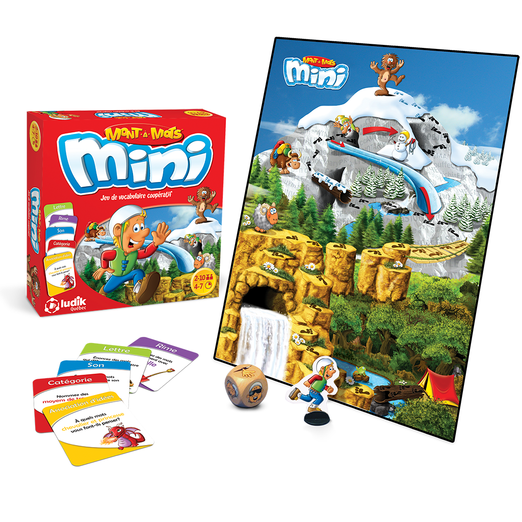 4 à 7 ans, 2 à 10 joueurs Un jeu de vocabulaire coopératif Aidez l’alpiniste Sam à rejoindre le yéti au sommet de la montagne! Amateurs de jeu de mots, voilà votre chance de briller aussi en alpinisme avec Sam, qui a besoin de votre rapidité et de votre vocabulaire pour franchir les obstacles et atteindre le sommet de la montagne. Lancez le dé, découvrez sur une carte le défi que vous aurez à relever et chaque fois que vous réussissez, Sam peut avancer un peu plus vers son but. Qui l’emporte? L’équipe ou le joueur qui, le premier, permettra à Sam d’atteindre le sommet de la montagne.