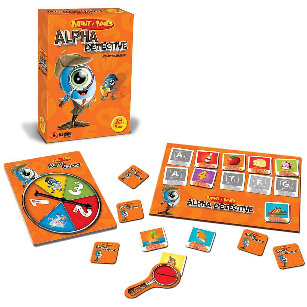 5 ans+, 2 à 4 joueurs Favorise l’apprentissage de l’alphabet et du nouveau vocabulaire Soyez le premier détective à retrouver les photos manquantes. Tournez la roulette et dévoilez le nombre de photos indiqué. Énoncez l’orthographe du mot illustré sur la photo et servez-vous de la loupe pour la vérifier. Placez la photo sur la lettre qui correspond à la première lettre de ce mot. Qui l’emporte? Le premier joueur à découvrir les photos manquantes.