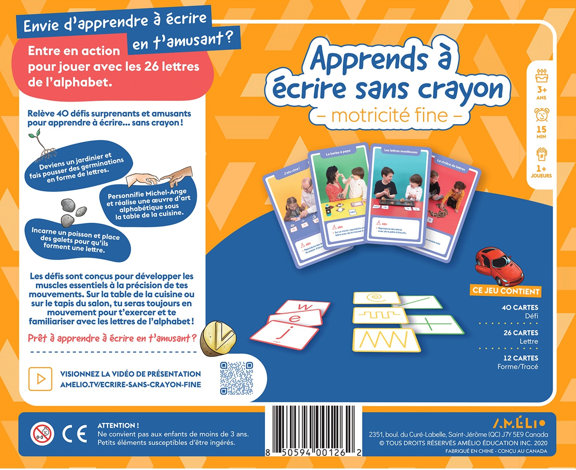 3 ans +, 1 joueur +, 15 minutes Envie d’apprendre à écrire en t’amusant? Joue avec les lettres de l’alphabet de 1001 façons différentes! Laisse le hasard te proposer des stratégies amusantes pour apprendre à écrire sans crayon! Crée une œuvre d’art alphabétique avec de la mousse à raser. Réalise un abécédaire avec un jeu de construction. Deviens un artiste des lettres en utilisant des haricots. Attention! Les défis sont croissants. Tu auras des contraintes de posture et des embûches qui viendront ajouter du mouvement à l’aventure. Tu pourras même jouer avec des adultes. Des défis sont conçus pour eux.