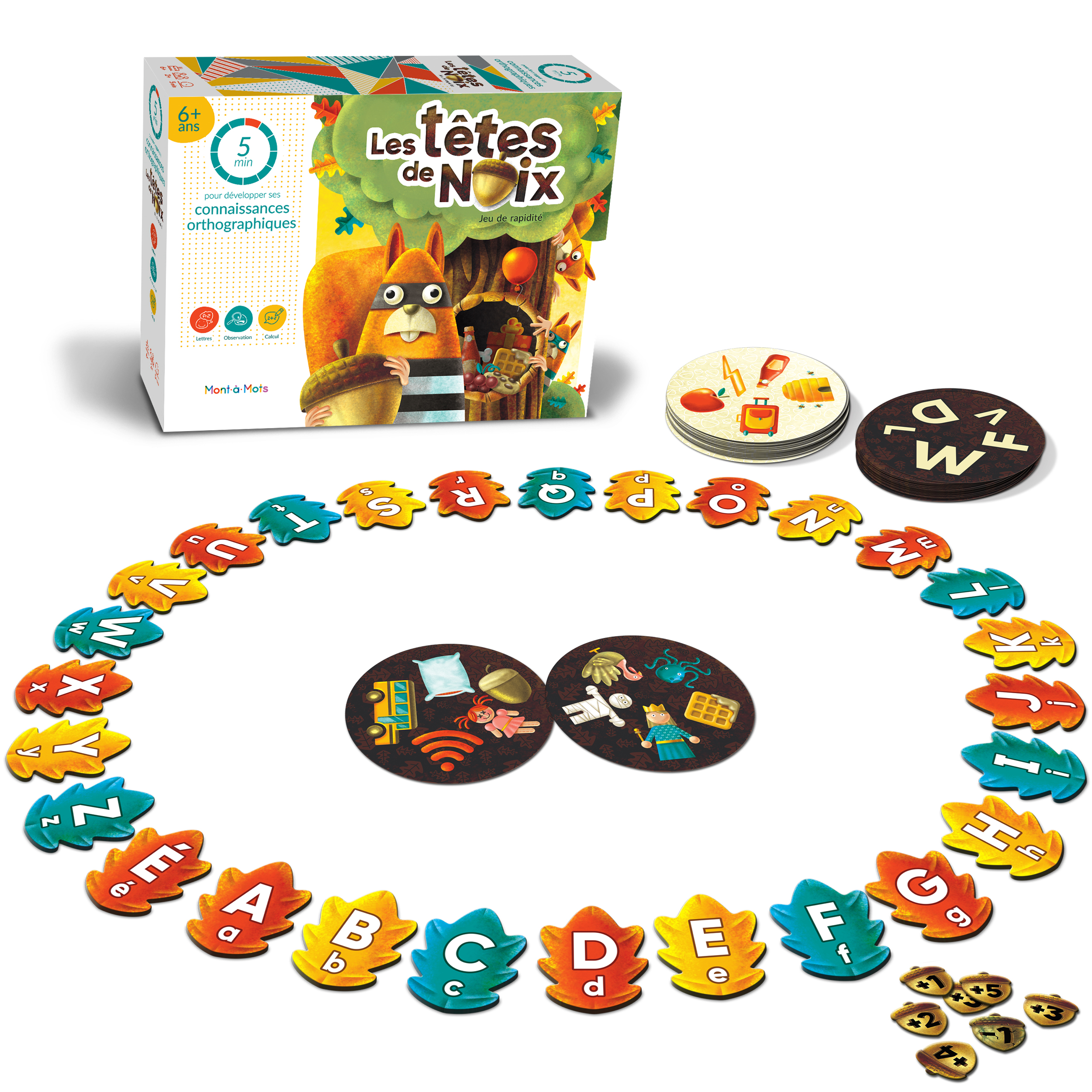 6 ans+, 1 joueur, 5 minutes Les Têtes de Noix – Monts-à-Mots, 5 MINUTES pour développer les connaissances orthographiques de votre enfant En 5 minutes, l’enfant développe : + Développe son habilité à jouer avec les lettres + Exerce son sens de l’observation + Pratique ses habilités de calcul mental Jeu de rapidité! Ta réserve de noix aura-t-elle la plus grande valeur? Sois le premier à repérer la lettre qui débute l’un des mots illustrés et accumule les noix cachées pour obtenir le plus de points possible Bon à savoir : 2 ensembles de cartes réversibles, 3 niveaux de difficulté, 3 variantes de jeu!
