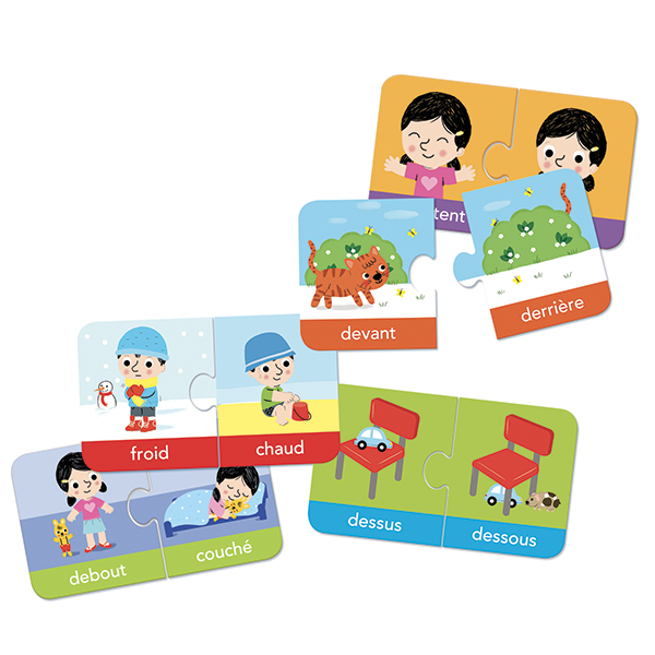 2 à 4 ans, 1 joueur 6 jeux progressifs pour découvrir les contraires en jouant seul ou à plusieurs. Des images affectives aux couleurs très gaies. L’enfant joue à associer un élément à son opposé. Il développe son vocabulaire en apprenant à nommer et à décrire les images.