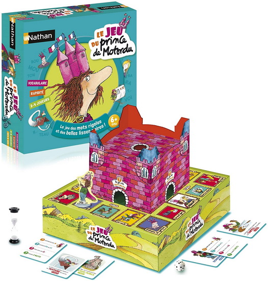 6 ans+, 2 à 4 joueurs, 10 minutes Un jeu de plateau pour s’amuser avec les mots et découvrir l’univers du Prince de Motordu. L’enfant lance le dé rond dans le château… Par quelle porte va-t-il ressortir ? Porte 1… c’est le jeu des initiales : l’enfant doit trouver quelque chose qui vole et qui commence par F… Porte 2…c’est le jeu des syllabes : il faut trouver un nom d’animal qui contient “CHA” ou “CA”… Porte 3… c’est le jeu des rimes. Porte 4… le jeu du max de mots ! Chaque défi relevé permet de remporter des cartes récompenses avec des mots tordus.