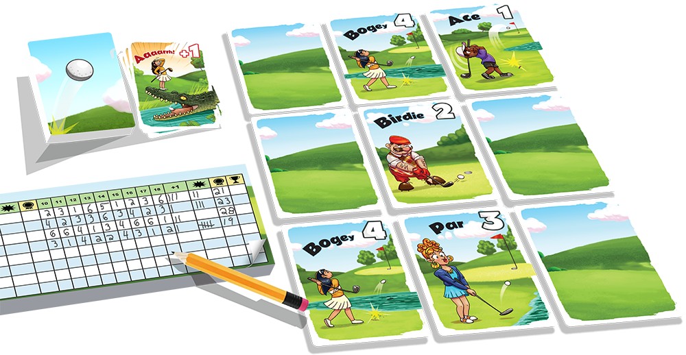 Complétez le parcours de 18 trous en récupérant vos cartes de faibles valeurs afin d’avoir le pointage le moins élevé et gagner la partie!