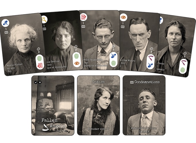 Fallen Angels est un jeu de cartes coopératif basé sur une mécanique de déduction unique, et présentant les photos d’identité des vrais criminels de Sydney au plus fort des années folles. Il a été conçu par John Kean, l’esprit brillant derrière le jeu solo primé Black Sonata.