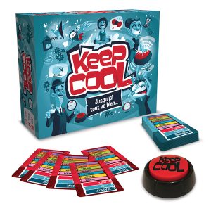 Déjà en partant, un jeu qui demande de frapper sur un gros « buzzer » rouge à la fin de notre tour, c’est vraiment gagnant! Dans Keep Cool, chaque joueur à une série de mots à faire deviner. À notre tour, nous devons dire qu’un seul mot. Soit un indice pour notre voisin de gauche qui doit deviner nos mots, soit une tentative de réponse pour deviner l’un des mots de notre voisin de droite. Le « hic », c’est qu’on ne peut pas dire notre mot correspond à quoi. C’est donc la confusion totale entre indices et réponses. C’est chaotique et vraiment très drôle comme jeu!