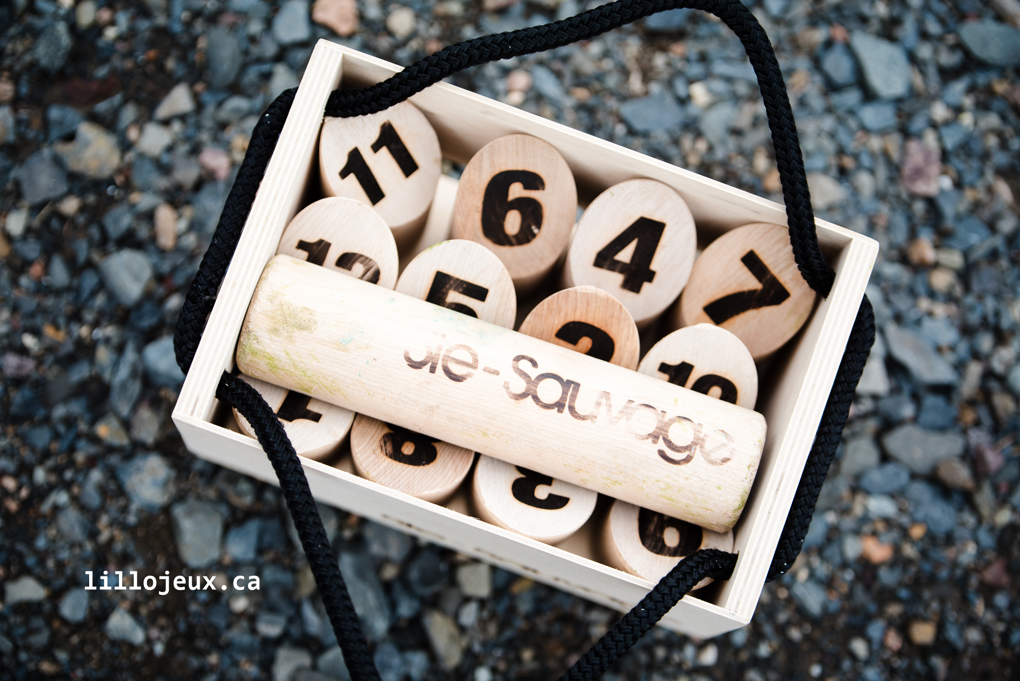 Le jeu de quilles finlandaises est un jeu d’extérieur palpitant qui se joue sur toutes les surfaces : gravier, gazon, sable et même sur la neige! On place les douze quilles et on lance la bûche. Si on fait tomber plus d’une quille, on marque autant de points que de quilles qui ont tombé ; si on fait tomber une seule quille, on marque la valeur inscrite sur la quille. Puis, on relève les quilles là où elles pointent ; elles viennent donc à s’étaler de plus en plus. Le but : arriver exactement à 50 points!