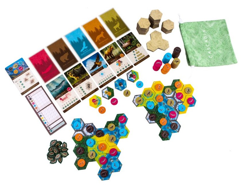 Cascadia est un jeu à base d’assemblage de tuiles et de draft de jetons mettant en scène les habitats et la vie sauvage du Nord Ouest du Pacifique. Au fur et à mesure des tours, les joueurs construisent leur propre zone de terrain et la peuplent avec la faune disponible.