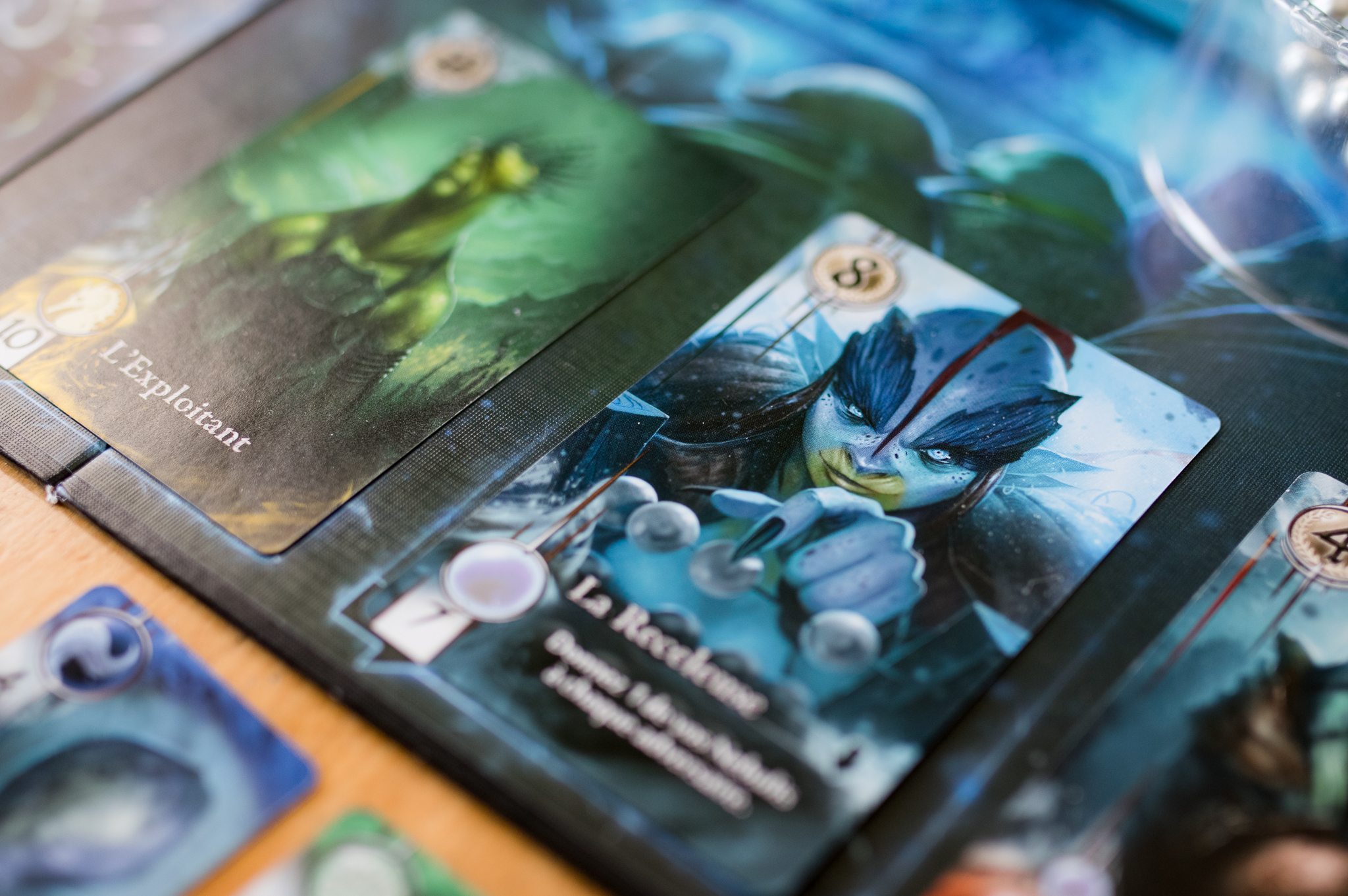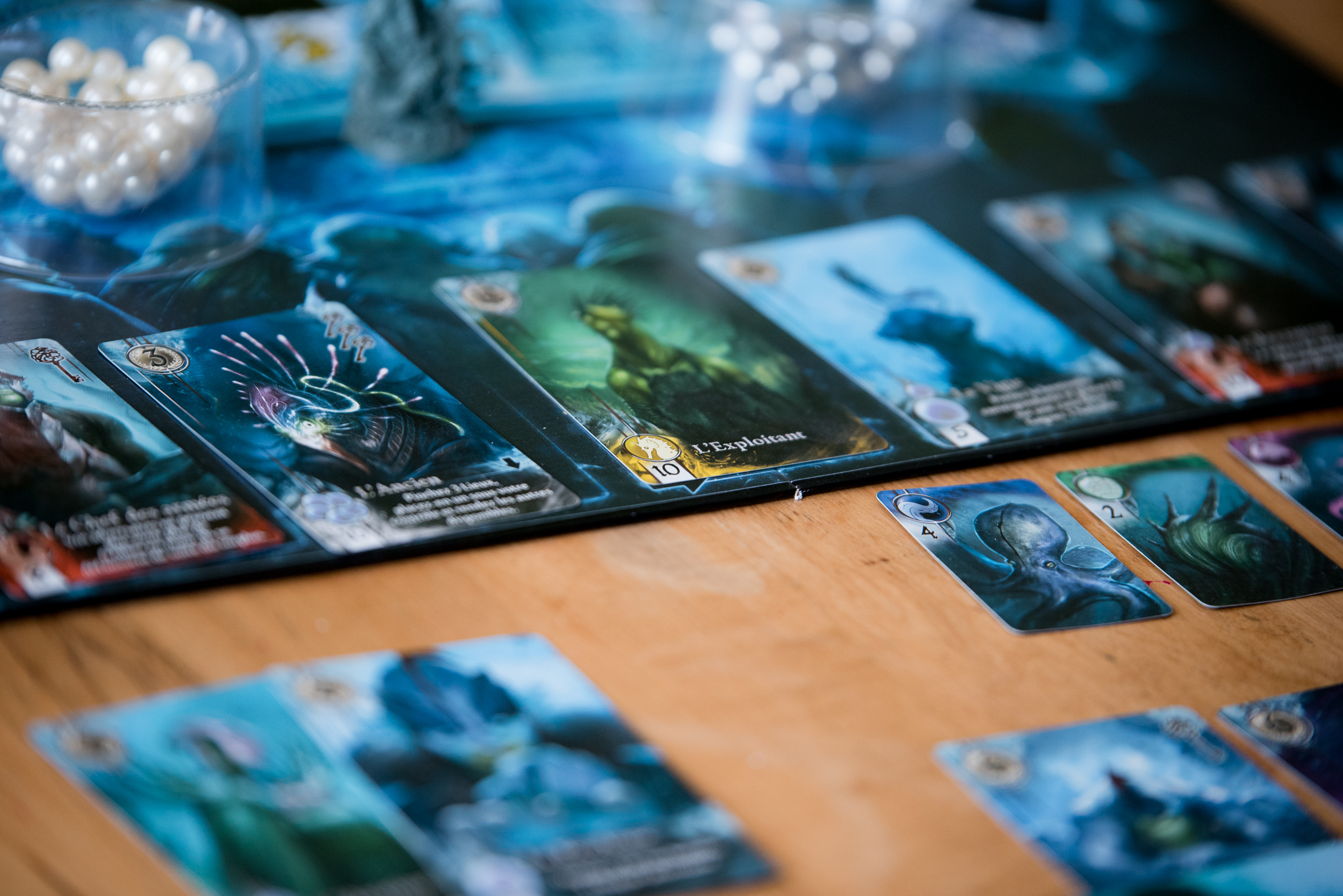 Le principe de base est simple. C’est relativement un jeu de collection de cartes de couleur (un peu comme Les Aventuriers du Rail), mélangé avec un jeu de type « Stop ou encore », car on a toujours le choix d’arrêter notre exploration pour avoir un allié d’un certain niveau ou continuer pour espérer avoir mieux. (Ou pire…) Vous êtes perplexes? Ne lâchez pas, je continue. On doit explorer les fonds marins en dévoilant, l’une après l’autre, des cartes « allié » (les petites cartes de couleur). Ces cartes nous permettent d’engager des Seigneurs (les grandes cartes de personnages tous aussi beaux les uns que les autres, mais je vais y revenir dans la prochaine section…). Pour ce faire, chaque Seigneur a ses prérequis : le nombre de guildes d’alliés différent à avoir (le nombre de cartes ayant des couleurs différentes) et la puissance totale des guildes (on additionne tous les chiffres sur nos petites cartes). Une fois embauchés, en plus de nous donner des points d’influence (c’est ce qui compte pour gagner la partie), les Seigneurs ont, généralement, des pouvoirs. Certains pouvoirs sont appliqués une seule fois, à leur embauche, d’autres sont utiles tout au long de la partie. De plus, certains Seigneurs sont aussi maîtres de lieux (ils ont un petit symbole de clef). Dès la découverte d’une troisième clef, les joueurs doivent se choisir un lieu. Ces lieux proposent plusieurs façons d’aller chercher des combos de points d’influence (ce qu’on veut pour gagner…) par exemple, des points supplémentaires pour les Seigneurs appartenant à un certain type de guilde, des points pour nos alliés fédérés, etc. L’inconvénient des lieux, c’est qu’ils annulent le pouvoir des Seigneurs avec une clef… Au travers de ça, on peut fédérer certains de nos alliés. Lorsqu’on embauche un Seigneur avec nos alliés, on les défausse tous, sauf le plus faible qu’on garde devant nous, car à la fin de la partie, on va compter la valeur de l’allié fédéré le plus puissant de chacune des guildes.