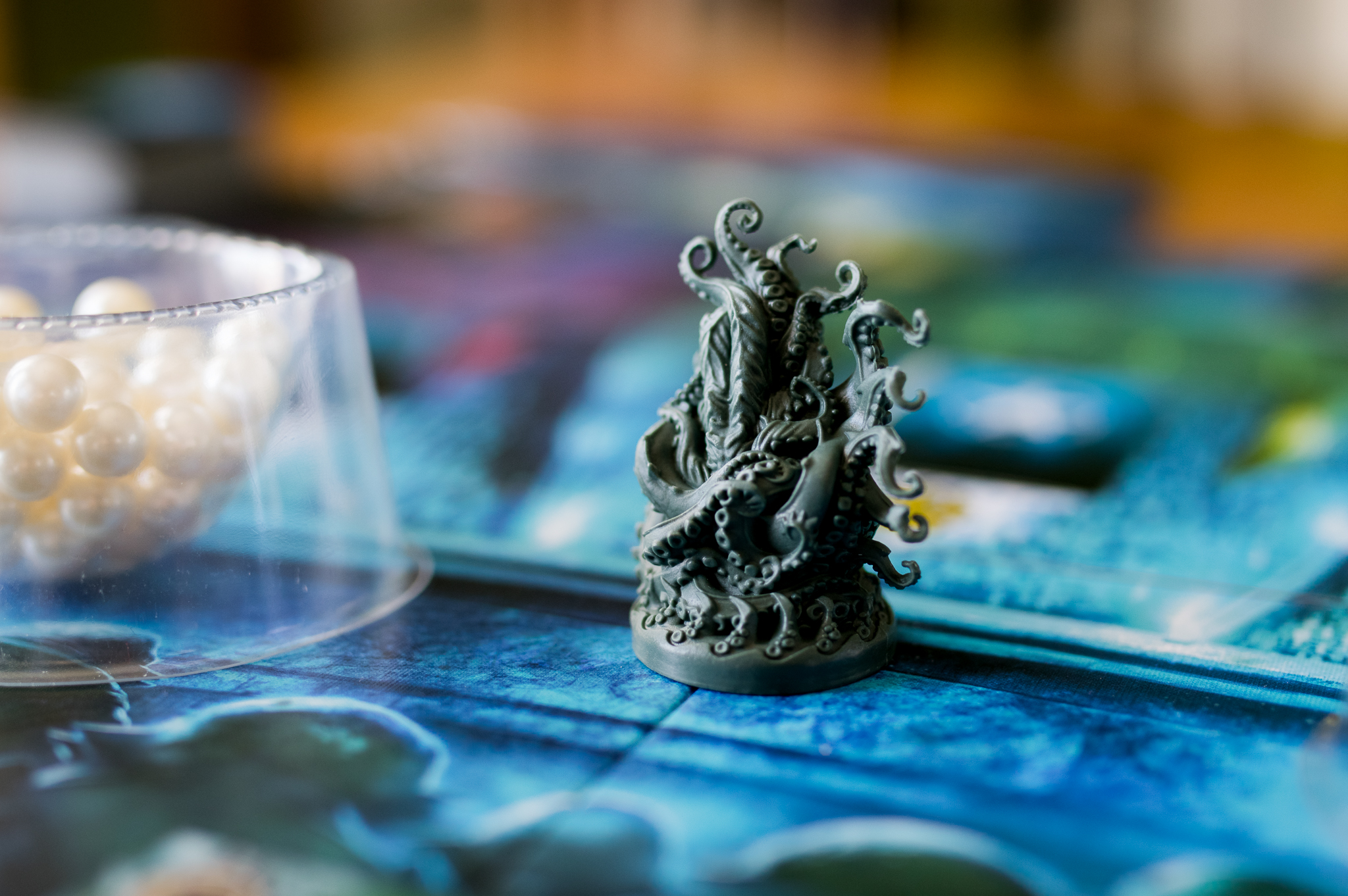 Ah oui! Je l’oubliais! Il y a même une petite figurine du Kraken qui ne sert pas à grand-chose, autre que de pointer le joueur qui a le plus de perles noires en main. Ce n’est vraiment pas un ajout essentiel, mais ça fait toujours chaud au cœur de jouer avec de petites figurines 😉