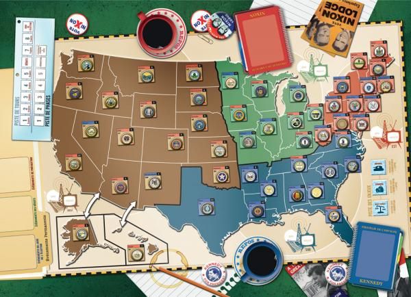 Vous incarnerez un de ces deux grands protagonistes s’affrontant pour diriger les Etats-Unis lors de l’ère de changements qui s’annonçait. Les candidats doivent prendre en compte toutes les problématiques de l’époque, de la guerre froide aux droits civiques. C’est une élection faite à la fois de positionnement et d’élan. Cette opposition a lieu sur la carte électorale des Etats-Unis telle qu’elle était en 1960. Le jeu utilise le système de card-driven, tous les événements majeurs de la campagne étant représentés : la barbe de trois jours de Nixon, le soutien tardif du président Eisenhower et la question catholique sont toutes des cartes d’événement. Le fameux débat télévisé est également un facteur essentiel du jeu.