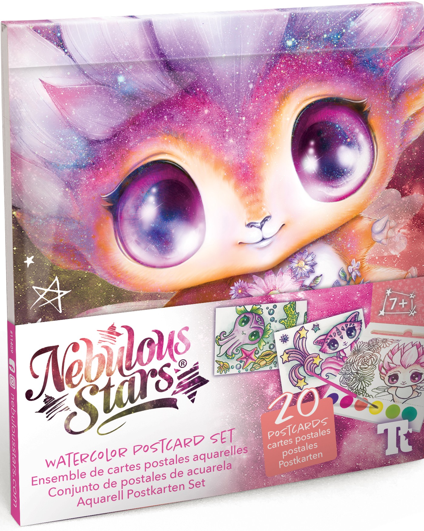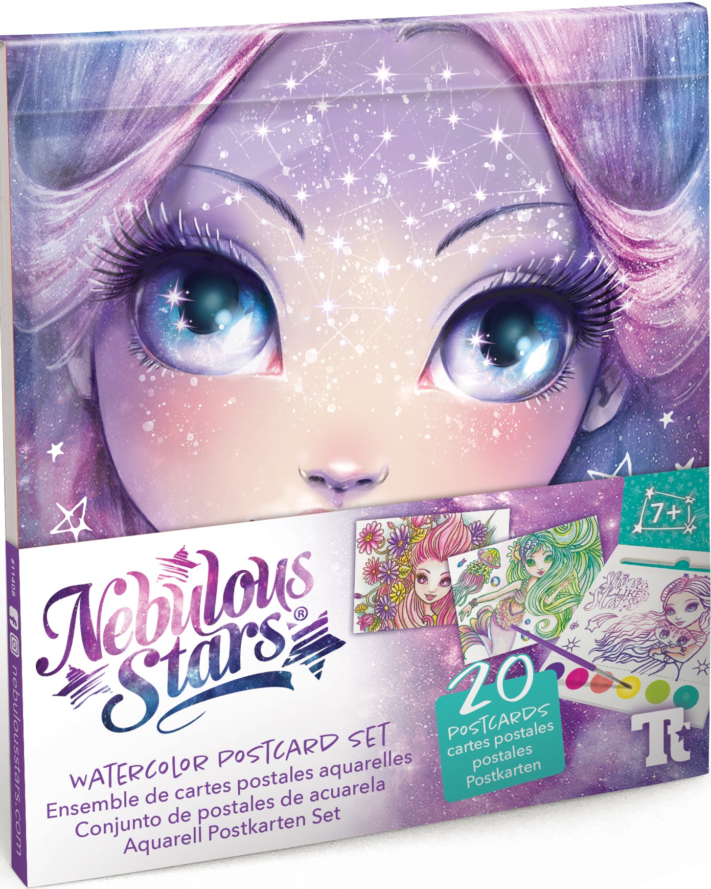 Inclus: 20 cartes postales, Pastilles d’aquarelle, Pinceau.
