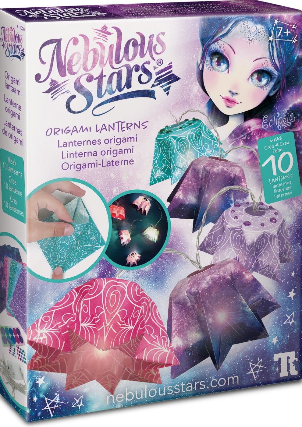 Inclus: Guirlande lumineuse DEL à piles, 11 feuilles d’origami imprimées, 10 ronds autocollants, 60 strass autocollants, L’histoire complète de Eclipsia, Instructions en couleurs.