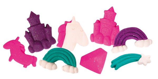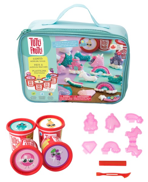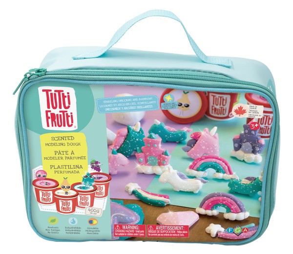 Ajoutez une touche de magie à votre monde étincelant de licornes et d’arcs-en-ciel en utilisant les moules spéciaux et la pâte à modeler scintillante Tutti Frutti. Dans un joli sac de transport en tissue de 10.75″ x 8.25″ x 3.5″