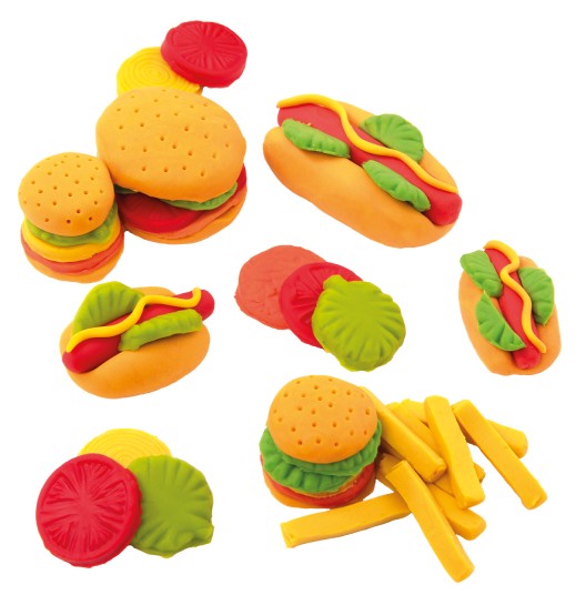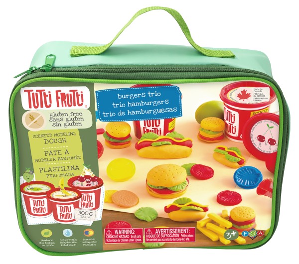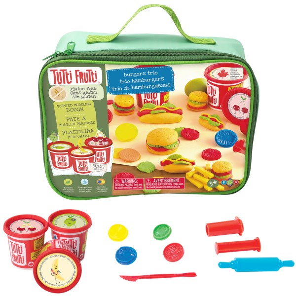 Regardez vos petits créer de délicieux hamburgers et hot-dogs avec le kit trio burgers. Trois bacs de pâte parfumée et colorée pour des combinaisons de couleurs et d’odeurs infinies !