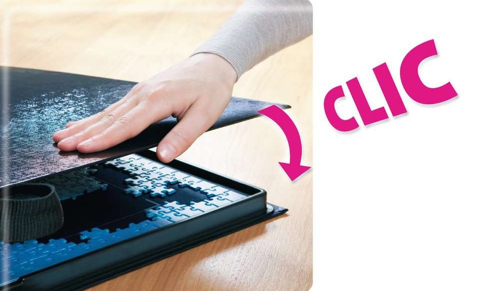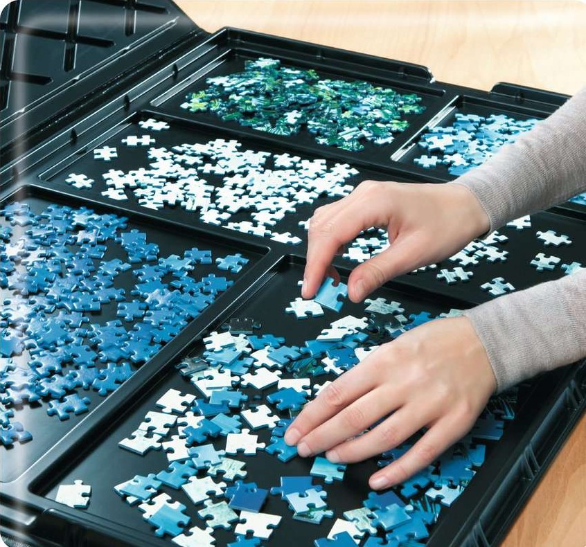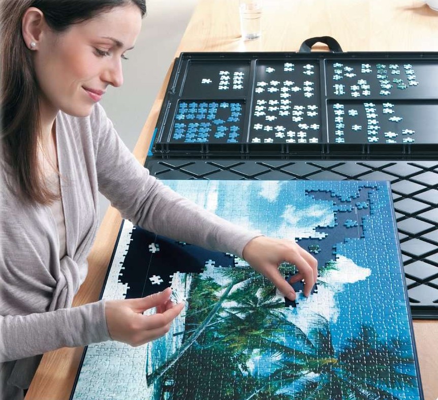 Poste de travail de casse-tête tout-en-un pour trier les pièces par couleur et forme dans 5 plateaux intégrés. Compris tapis de puzzle (taille max. du puzzle : 70 x 50 cm) avec aide à la pose ò Stockage sûr et transport facile.