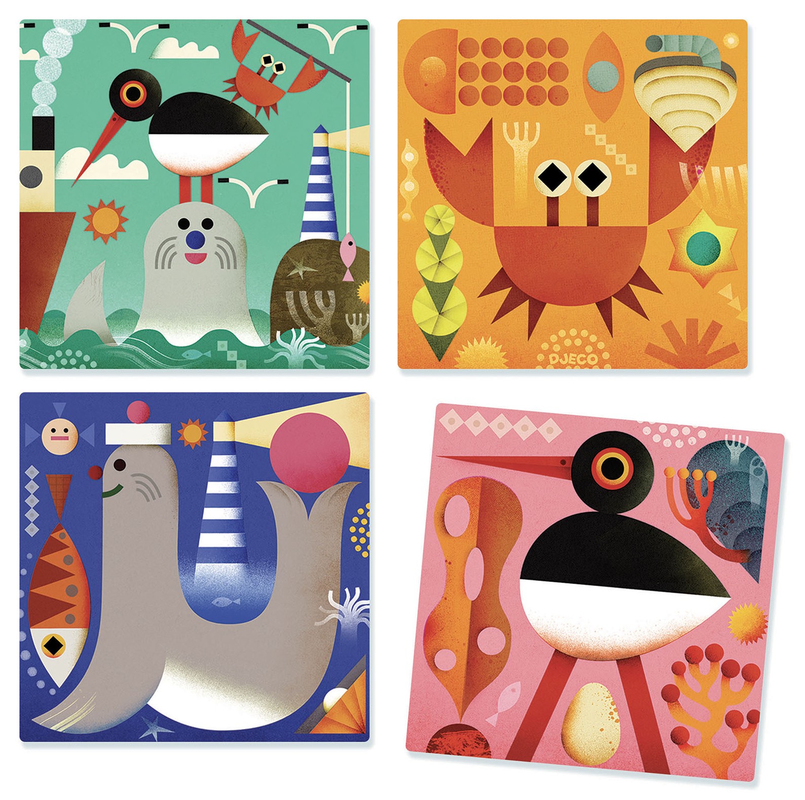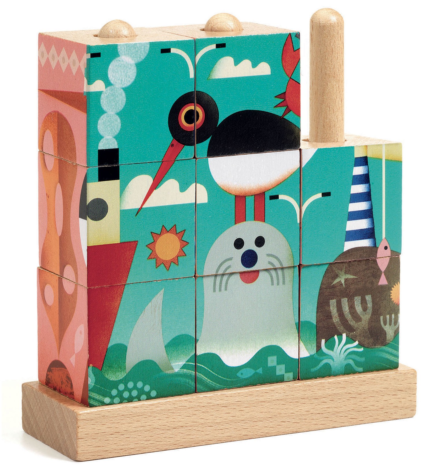 4 Puzzles sur le thème des animaux marins. Les 9 cubes en bois s’enfilent sur 3 tiges verticales pour aider l’enfant à les placer correctement.