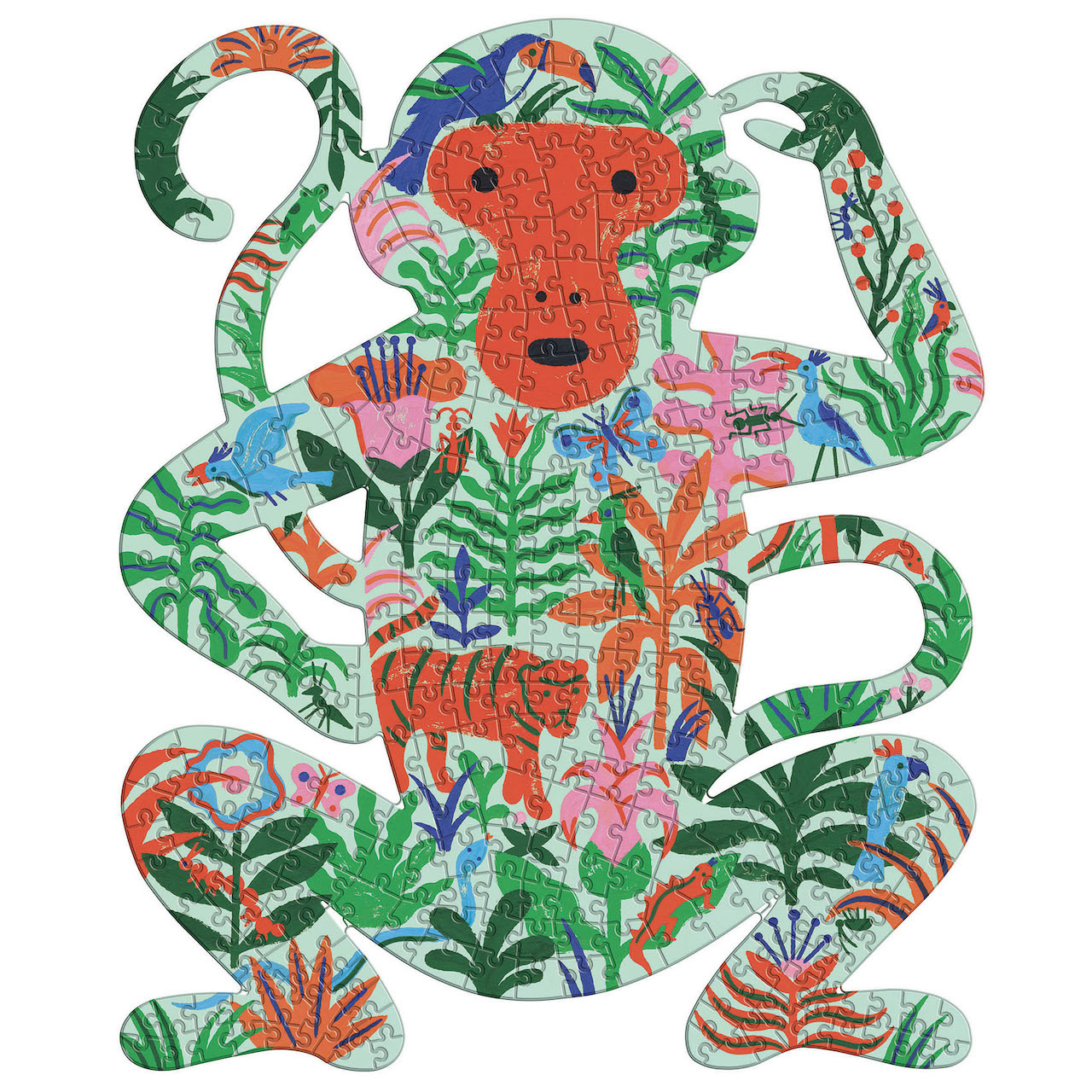 Le Puzz’Art Monkey est un puzzle de 350 pièces. Dans un format inédit, sans coins ni bordures, tout l’art du puzzle est bousculé. À travers cette grande silhouette ajourée, dans laquelle fourmille un monde imaginaire, l’enfant découvre un singe.
