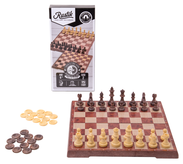 La belle construction en bois de pêcher ajoute de l’élégance au jeu traditionnel des dames et d’échecs de Rustik.