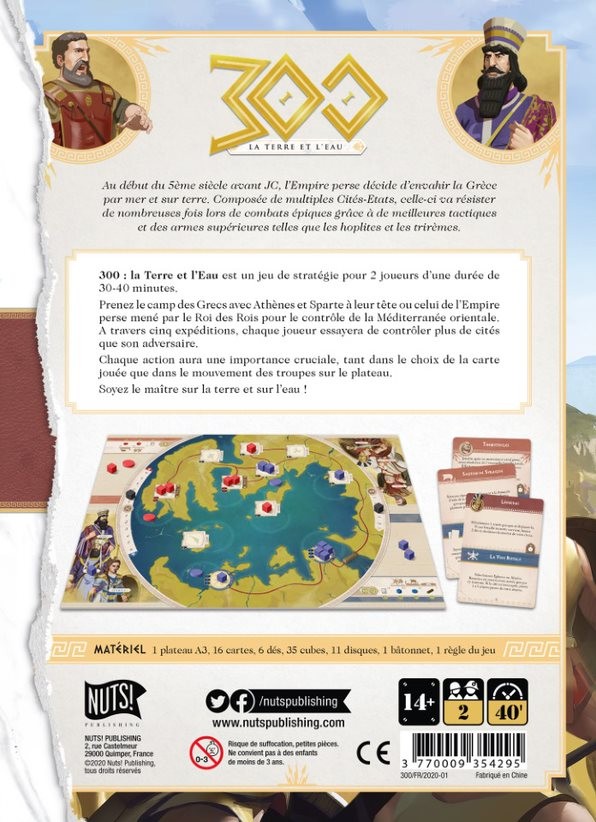 300: la terre et l’eau est un wargame pour deux joueurs. Un joueur contrôle les Grecs, rassemblés autour des Athéniens, et l’autre contrôle les Perses, luttant pour l’hégémonie de la Méditerranée orientale. À travers les cinq expéditions, chaque joueur lutte pour contrôler plus de villes que son adversaire.