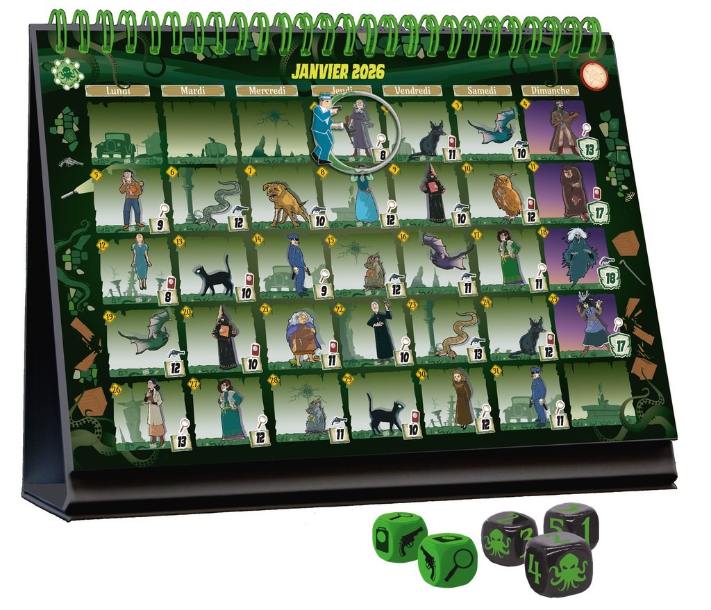 Contenu: 5 dés, 1 magnet investigateur, 1 calendrier.