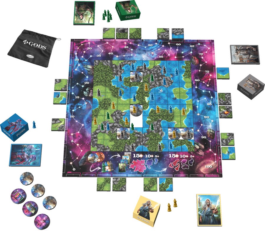 4 Dieux se sont réunis pour créer une planète entière en quelques millions d’années. Vous avez 30 minutes ! Donnez naissance à un nouveau monde, regardez le grandir et affirmez l’influence religieuse de votre dieu. Chaque seconde compte ! 4 Gods est un jeu de stratégie en temps réel comprenant construction de puzzle, positions majoritaires et destructions cataclysmiques. Les joueurs jouent en simultané : vous n’aurez jamais à attendre votre tour. Le jeu dispose d’une particularité assez exceptionnelle : plus il y a de joueurs, plus le jeu se déroule rapidement. Devenez la déesse des Elfes ou des Ondins, le dieu des Nains ou des Humains et construisez un monde complétement différent à chaque partie!