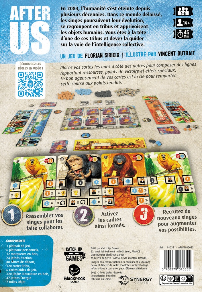 Pour l’emporter dans After us, vous devez atteindre 80 points de victoire avant vos adversaires. À chaque tour, tous les joueurs vont simultanément piocher les 4 premières cartes de leur deck puis les assembler, de gauche à droite, pour former des cartouches d’activation. Ils vont ensuite résoudre ces cartouches, un par un, de gauche à droite, pour gagner des ressources, des points de victoire ou activer les capacités spéciales de leurs primates. Tout le sel du jeu consiste donc à réaliser son assemblage judicieusement, en fonction de ce qu’on souhaite obtenir des cartes que l’on a piochées.
