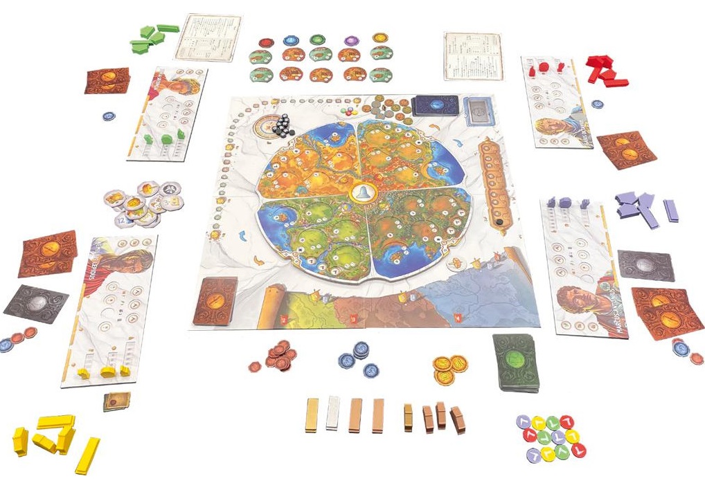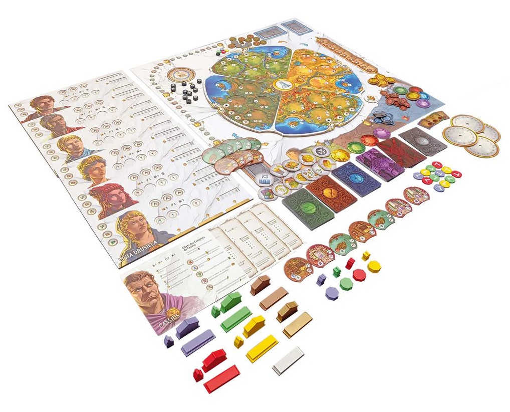 Contenu: 138 pions en bois, 114 cartes (format Euro), 89 jetons, 45 tuiles en carton, 12 plateaux, 5 fiches de référence, 2 livrets des règles