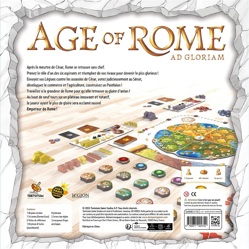 Travaillez à la grandeur de Rome pour qu’elle retrouve sa gloire d’antan ! Au bout de neuf tours sur un plateau innovant et rotatif, le joueur ayant le plus de gloire sera acclamé nouvel Empereur de Rome !