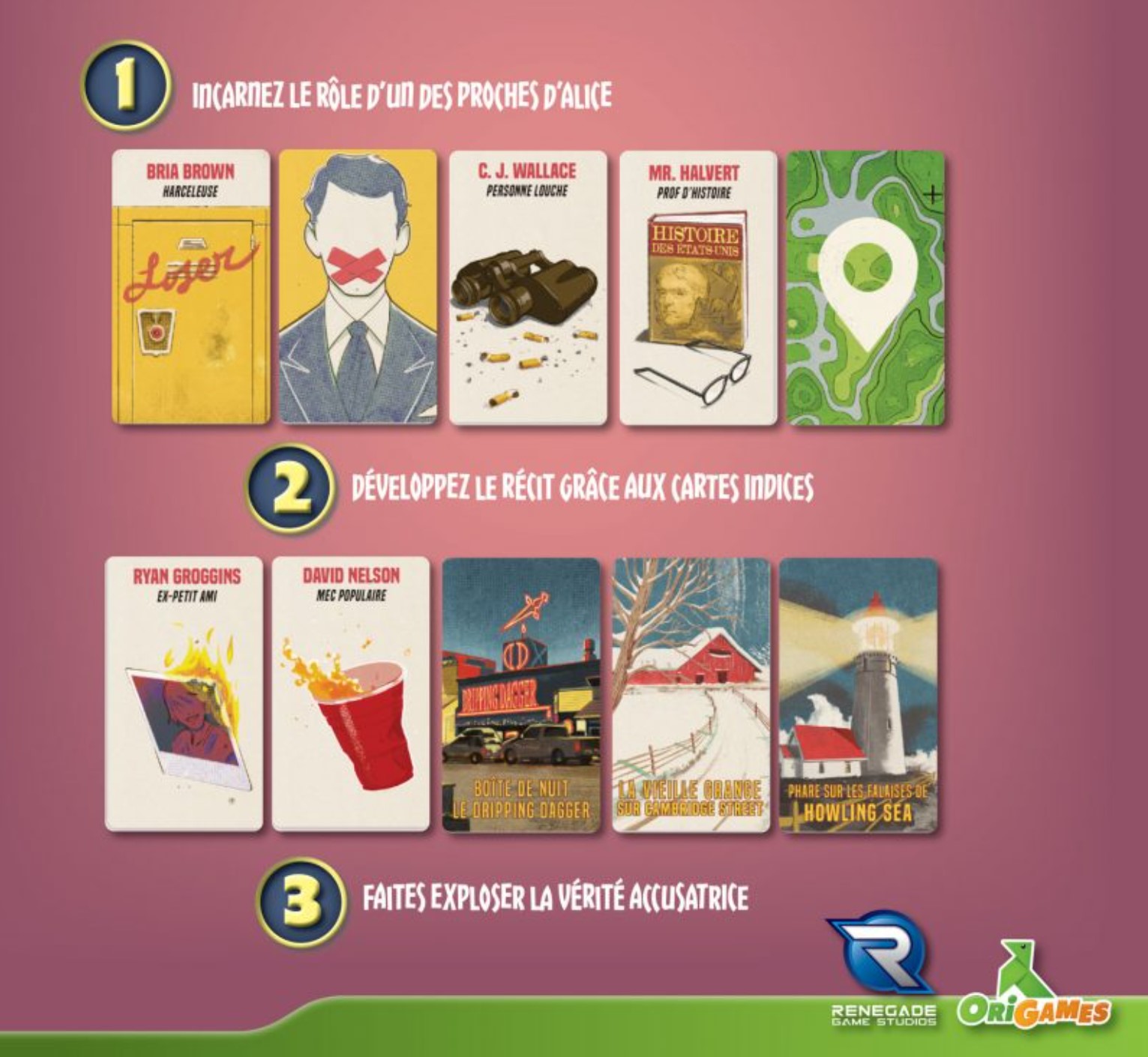 Durant les 90 minutes de la bande-son originale, c’est à vous et à votre groupe de démêler les fils de l’enquête. Développez progressivement la narration grâce aux événements des cartes individuelles et racontez ensemble, dans un silence plein d’incertitudes, l’histoire de la disparition d’Alice…