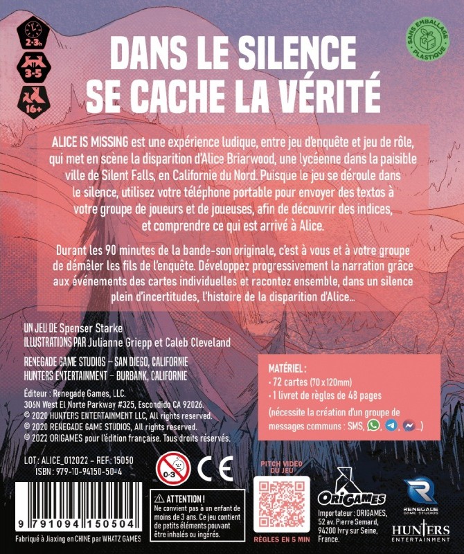 ALICE IS MISSING est une expérience ludique, entre jeu d’enquête et jeu de rôle. Alice Briarwood, une lycéenne de la paisible ville de Silent Falls en Californie du Nord, a disparu. Alice Briarwood, une lycéenne de la paisible ville de Silent Falls en Californie du Nord, a disparu. Vous êtes tous des proches d’Alice qui cherchez à découvrir la vérité.