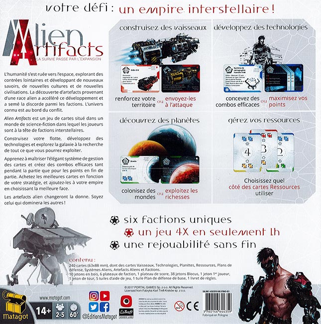 L’univers connu est au bord du conflit. Alien Artifacts est un jeu de cartes situé dans un monde de science-fiction dans lequel les joueurs sont à la tête de factions interstellaires.