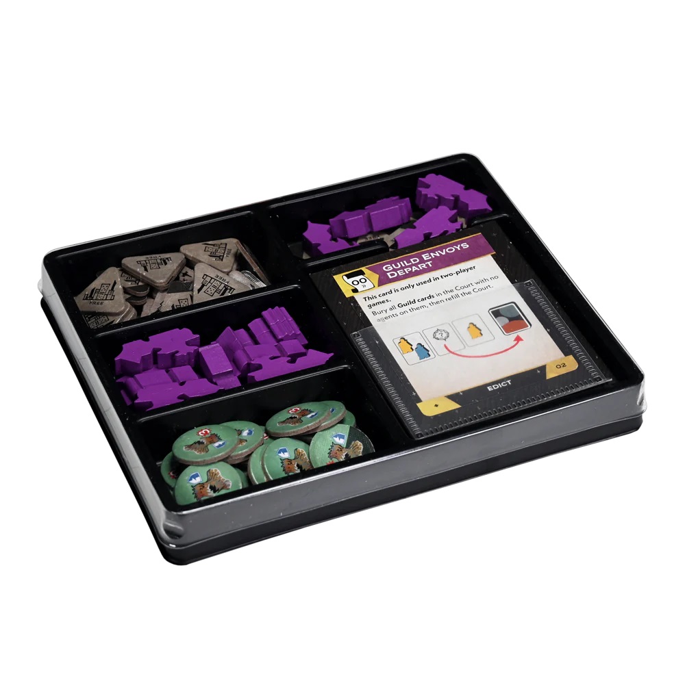 Rangement réfléchi. Cette boîte comprend de l’espace pour ranger le jeu de base Arcs, y compris les cartes avec pochettes. Le jeu comprend également des plateaux amovibles pour stocker facilement la progression de votre campagne entre les sessions.
