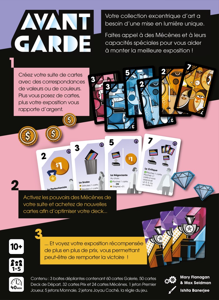 Présentez la meilleure exposition d’Avant-Garde : faites appel à des Mécènes et à leurs pouvoirs spécifiques pour optimiser votre deck de cartes et de gagner le plus de Prix pour remporter la victoire !