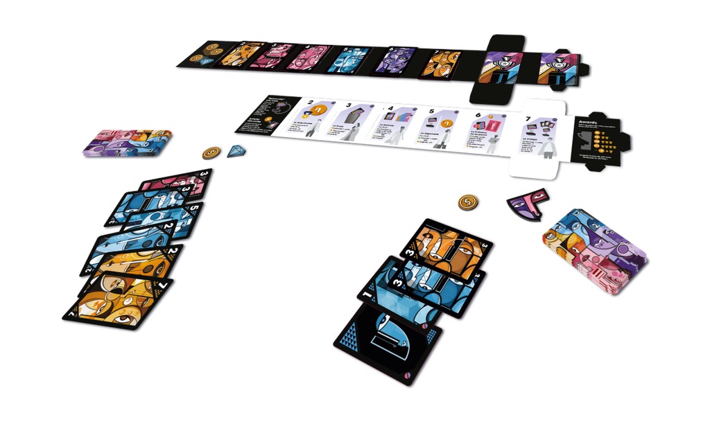 Contenu: 166 cartes, dans leurs boîtes déroulantes, 2 jetons Joyau caché, 5 jetons Monnaie, 1 marqueur Premier Joueur, la règle du jeu.