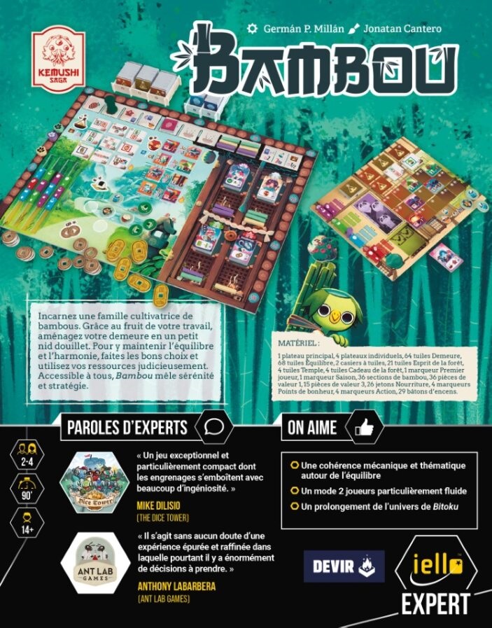 Incarnez une famille cultivatrice de bambous. Grâce au fruit de votre travail, aménagez votre demeure en un petit nid douillet. Pour y maintenir l’équilibre et l’harmonie, faites les bons choix et utilisez vos ressources judicieusement. Accessible à tous, Bambou mêle sérénité et stratégie.