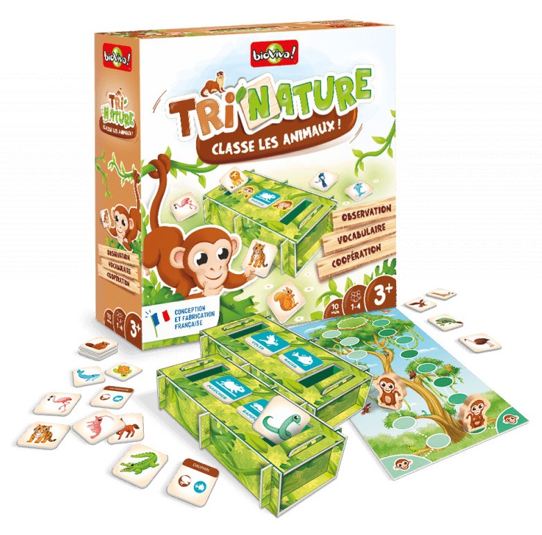 Comment jouer ? Dans ce jeu, les joueurs trient ou classent les animaux selon leur enveloppe corporelle ou leurs modes de déplacement. Si un animal a été correctement trié ou classé, le pion « Singe malicieux » monte d’une case sur le plateau « Arbre à singe », sinon, c’est le pion « Singe ronchon » qui progresse. Si le petit singe malicieux arrive plus haut dans l’arbre que le singe ronchon, les enfants gagnent la partie.