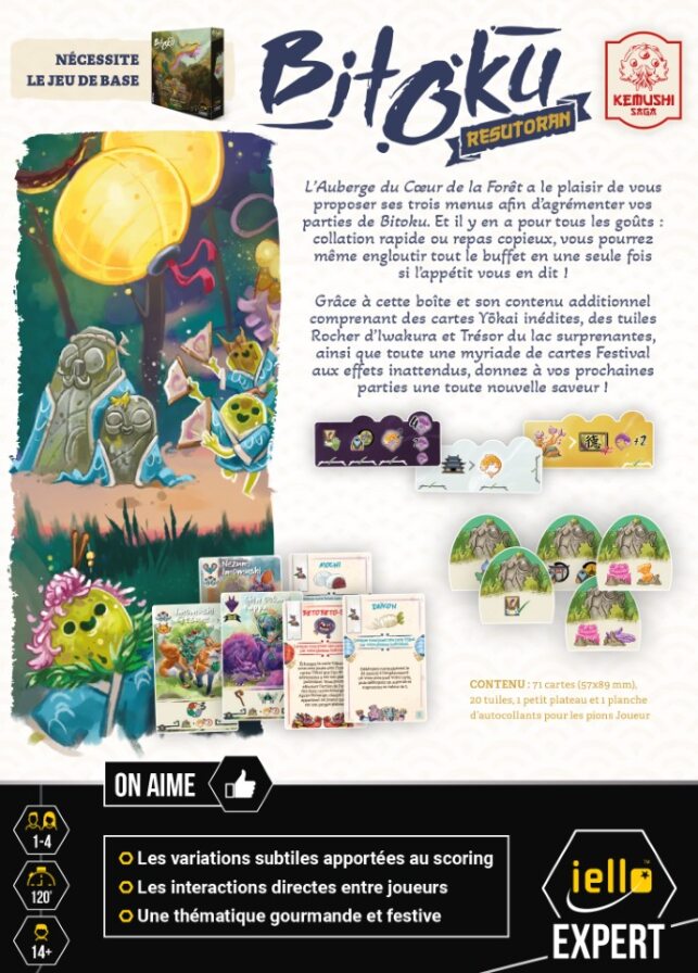 L’Auberge du Cave de la forêt a le plaisir de vous proposer ses trois menus afin d’agrémenter vos parties de Bitoku. Et il y en a pour tous les goûts : collation rapide ou repas copieux, vous pourrez même engloutir tout le buffet en une seule fois si l’appétit vous en dit. Grâce à cette boîte et son contenu additionnel comprenant des cartes Yokai inédites, des tuiles Rocher d’Iwakura et Trésor du lac surprenantes, ainsi que toute une myriade de cartes Festival aux effets inattendus, donnez à vos prochaines parties une toute nouvelle saveur !