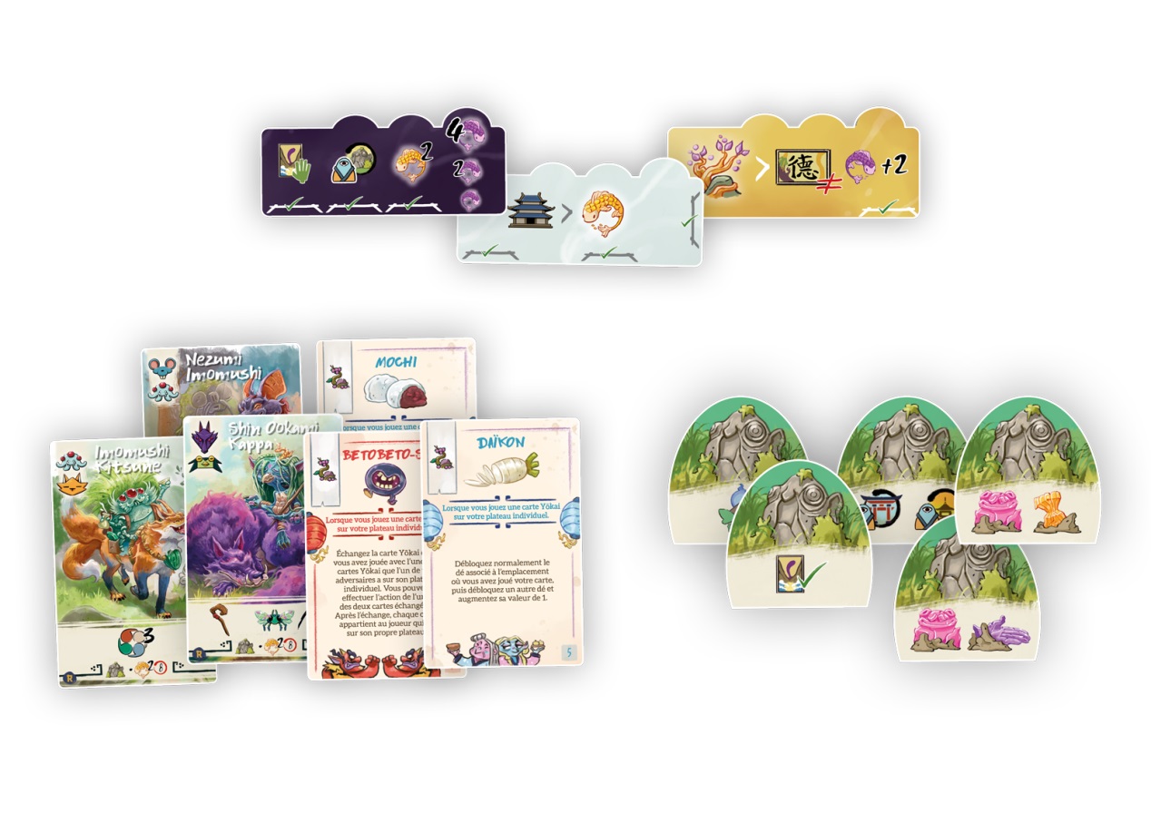 Voulez-vous le menu complet ? Ajoutez-les tous ! Voulez-vous essayer une bouchée ? Ajoutez-en un seul et profitez du banquet. Les modules incluent de nouvelles roches Iwakura, de nouvelles cartes Yokai et trois nouveaux types de lac Kodama, ainsi qu’un nouveau jeu de cartes qui permettra aux joueurs d’activer certains effets pendant le jeu, comme modifier les résultats des dés ou gagner beaucoup de points.