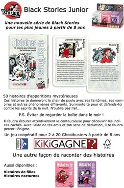 Black Stories Junior: Histoires de Fantômes, chaque boite contient 50 énigmes à décoder. Il faudra écouter attentivement le conteur/euse pour découvrir les indices.