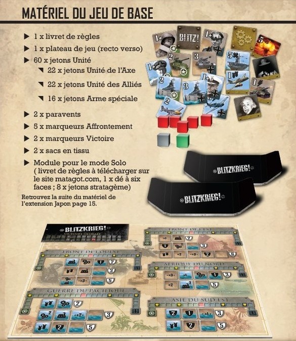 Entrez dans la Seconde Guerre Mondiale : incarnez la Coalition Alliée ou les puissances de l’Axe et affrontez-vous pour prendre le contrôle des principaux théâtres d’opérations ! Faites face à de nombreux choix décisifs ! Piochez des jetons Unité de votre sac pour déterminer votre force et compenser vos pertes. Une bonne perception du champ de bataille vous permettra d’allouer vos ressources militaires aux meilleurs postes pour les campagnes de chaque bataille décisive, vous assurant ainsi la victoire.