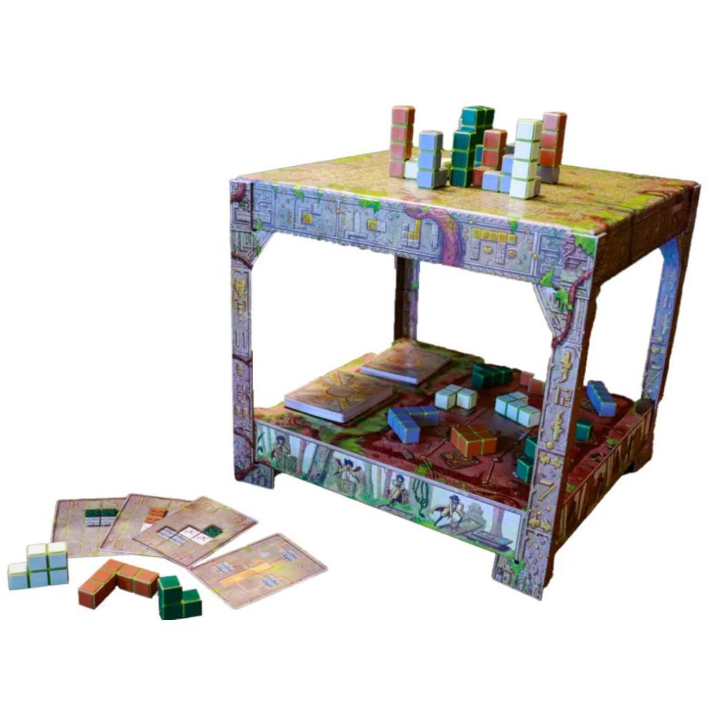 Contenu: 40x Blocs en argile (10 formes/4 couleurs), 1x Cube en argile, 24x cartes Clé Soleil, 16x cartes Clé Lune, 8x cartes Clé Étoile, 4x cartes Énigme, 4x supports de colonne, 1x sac brodé, 1x boite de jeu (convertible en aire de jeu).