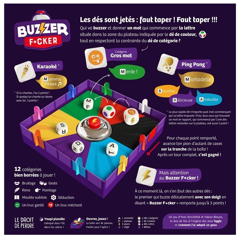Les dés sont lancés ! Ton objectif : buzzer, dès que tu as trouvé une réponse qui commence par la bonne lettre et qui entre dans la catégorie affichée par le gros dé ! Du karaoké (chante et double tes points!) au gros mot, en passant par les mimes, les bruitages, les compliments, etc. tous les mots ou presque sont bons pour avancer ton pion !