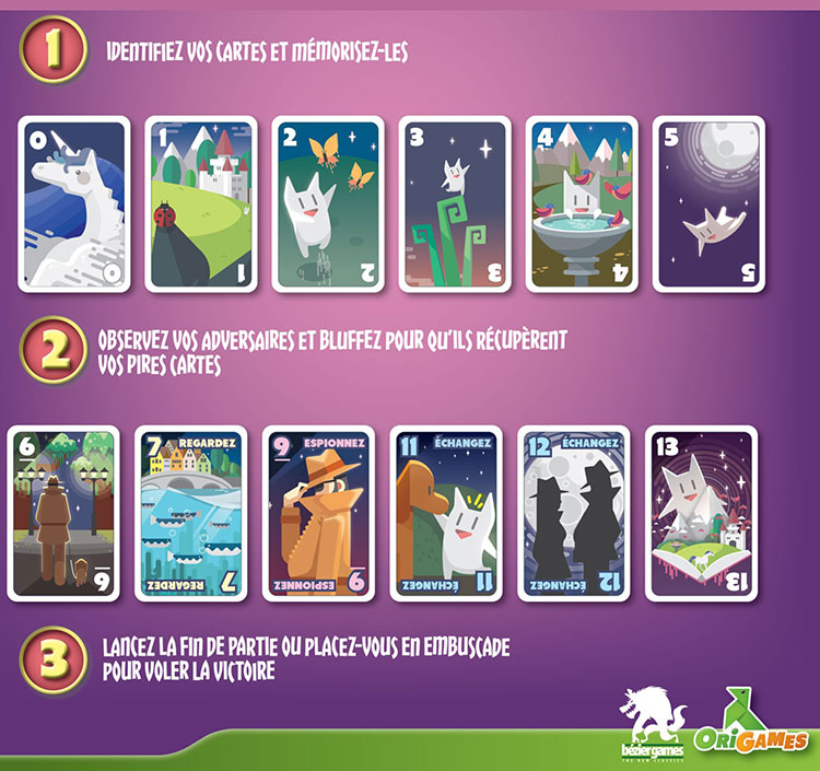 Avoir le moins de points possible. Mais comment le savoir alors que toutes les cartes sont retournées ? Faites preuve de bluff pour influencer le choix des autres chercheurs de licornes ou tentez le tout pour le tout !