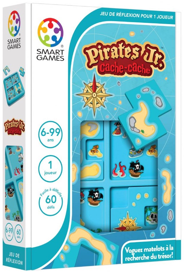 Cache-Cache Pirates Jr vous propose de placer aux bons endroits les quatre tuiles « îles » afin d’aider les pirates à trouver ce qu’ils recherchent. Les hardis marins de tous âges pourront s’exercer au cours des 60 défis proposés dans ce coffret qui est également un jeu de voyage.