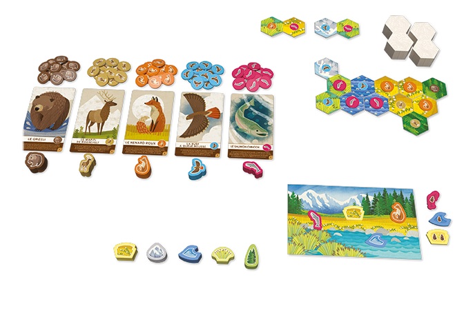 Contenu : 50 tuiles Habitat, 90 jetons Faune, 30 pions Découverte d’habitat, 30 pions Découverte de faune, 5 cartes Faune, 4 plateaux Panorama, 1 livret de règles.