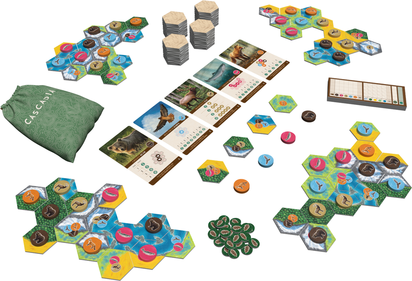 Cascadia est un jeu à base d’assemblage de tuiles et de draft de jetons mettant en scène les habitats et la vie sauvage du Nord Ouest du Pacifique. Au fur et à mesure des tours, les joueurs construisent leur propre zone de terrain et la peuplent avec la faune disponible.