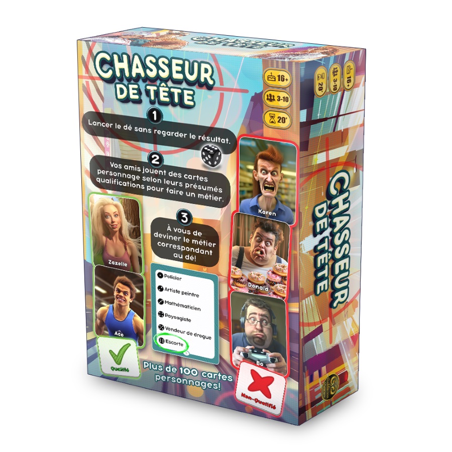 De façon coopérative, faites découvrir des métiers à vos amis en utilisant des cartes Personnages. Tenter de faire une bonne lecture des indices pour deviner 7 métiers et gagner la partie!
