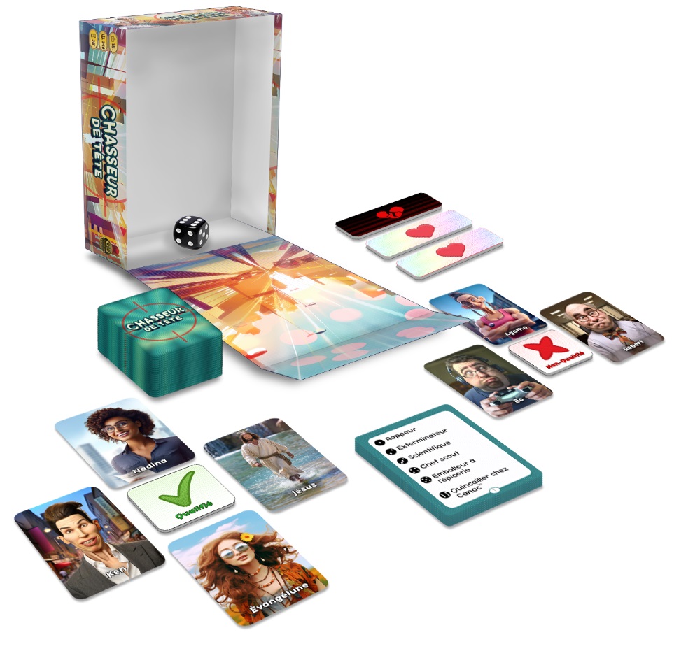 Contenu: 1 Boîte magnétique, 1 Livret de règles, 126 cartes (100 cartes Personnages et 26 grandes cartes Métiers), 5 tuiles (3 tuiles Vie et 2 tuiles Qualification), 1 Dé.